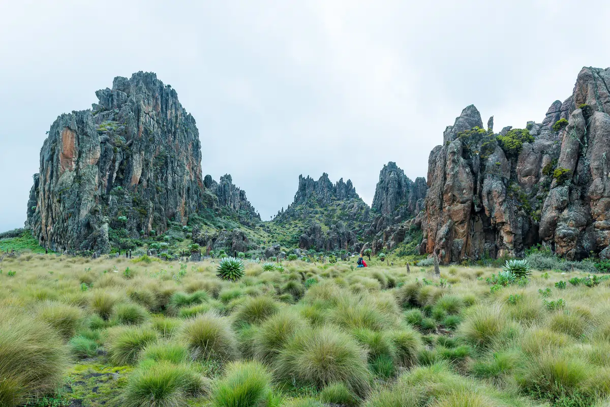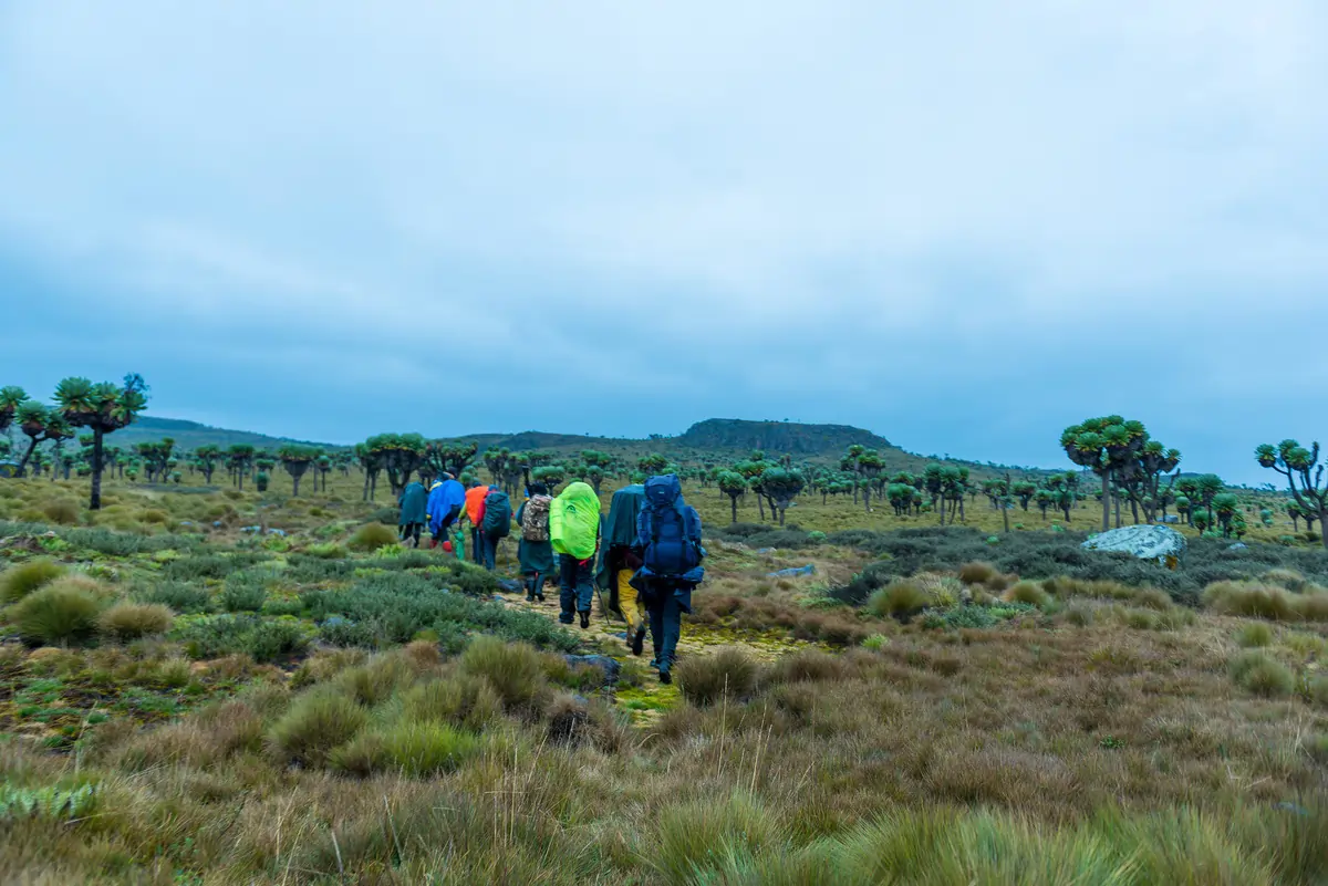 After a short uncomfortable break in the rain, we trekked on the top of the ridge with stunning views of the Northern Aberdare moorlands. The southbound route passed by the recently famous pointed peak by the name of “Rhino” or “Kenyan Matterhorn” to some, to our destination for the day, the 7 Ponds Camp.