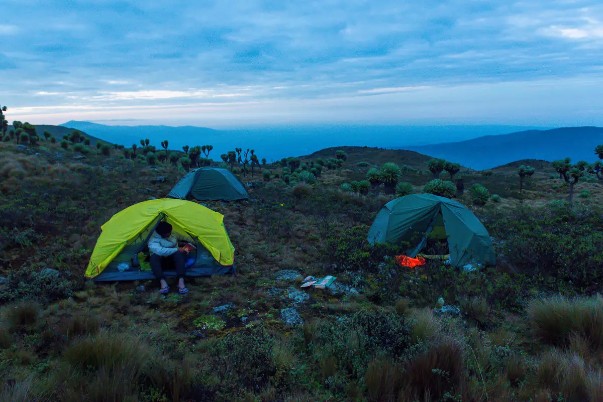 Spirits dipped and fatigue set in as we pushed on through eerie cloud shifts and moody drizzle. Ideally, you reach camp by 4 p.m. — time to settle, reflect, and prep for the cold night ahead. But that day, we found ourselves still walking with only two hours of daylight left, a sobering reminder that the Aberdare Ranges are unforgiving. By then, we had sore shoulders, tired legs, and “laughing shoes.” Yet no one gave up. Even those seeing “visions” of strange things pressed on — rock-hopping and dragging themselves to camp.